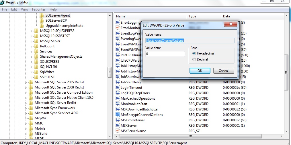 - Go to target server open run and type ‘regedit’ and press enter button.Follow the below path given in screen shot and change value for ‘MsxEncryptChannelOptions’ value to ‘0’.