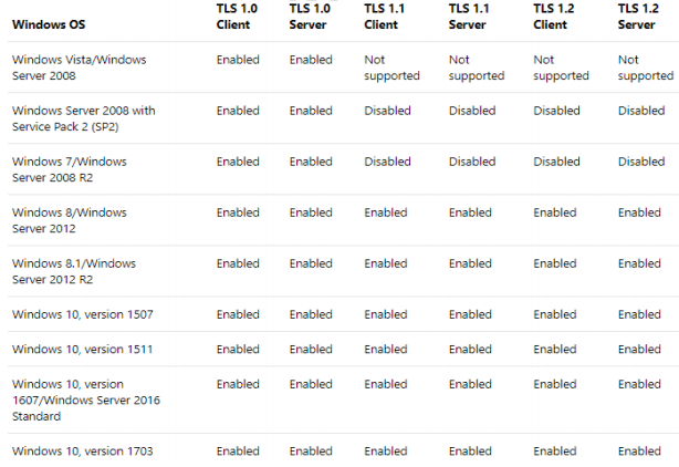 The following table displays the Microsoft Schannel Provider support of TLS protocol versions. Default:- ENABLED