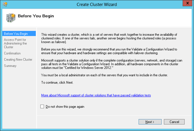 Once we click on create cluster the below screen will pop-up, click next to start installation for windows cluster.
